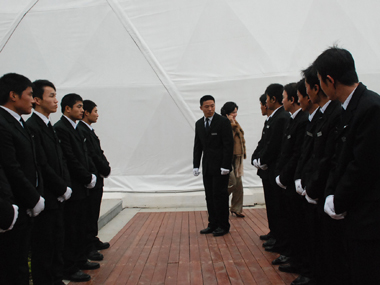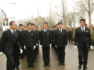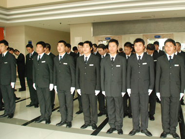 11月29日60余名擎天隊員脫下制服換上西裝,整裝待發(fā)。10點準時到達活動目的地---“華麗家族-太上湖”項目地。隊員下車后排成了整齊的方隊,統(tǒng)一的服裝,整齊的步伐,帥氣的面孔,響亮的口號吸引住了所有人的目光。