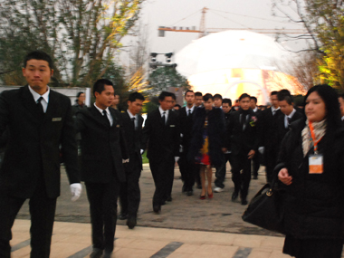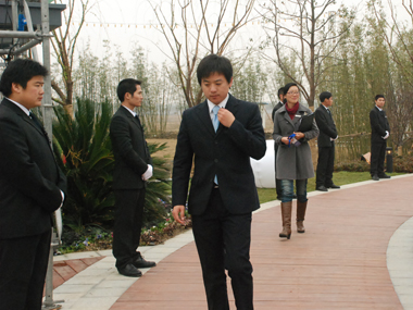 11點開始,隊員開始疏散現(xiàn)場所有閑雜人員,12點的時候,清理完畢。13點進入布防崗位,14點我們的特保乘專車趕往梁朝偉和劉嘉玲下榻的酒店。15點整,梁朝偉、劉嘉玲亮相,他們在貴賓休息室里稍作休息后,進入新聞發(fā)布會現(xiàn)場,梁朝偉和劉嘉玲在我司8名隨身特衛(wèi)的保護下閃亮登場。同時到場的還有華麗家族的王偉林董事長及其夫人一行。隨后, “華麗家族.太上湖”全球第一買家簽約儀式及記者招待會開始,由著名主持人曹可凡和陳蓉主持。8名特衛(wèi)寸步不離兩位重量級嘉賓,其余隊員則負責(zé)外圍安全。